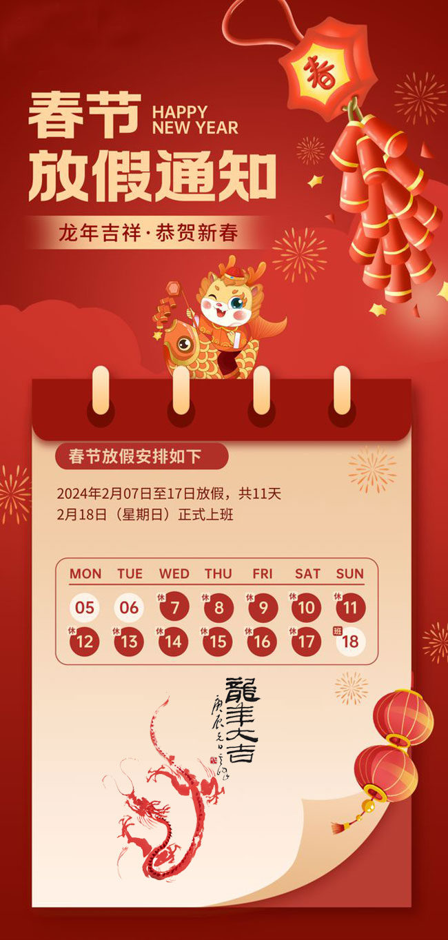 具體放假時(shí)間為:2024年2月7日-2月17日放假,共11天,2月18日(星期天)正式上班。放假期間網(wǎng)站問題電話或微信反饋,我們第一時(shí)間處理,電話:15399213588(同微信)